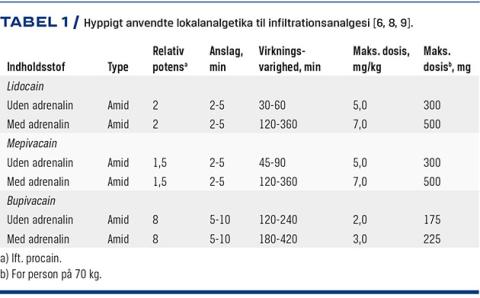 Lokalanalgetika af amidtypen blokerer natriumkanaler i nervecellemembranen, hvorved nociception ophæves lokalt, hvilket muliggør hurtig og effektiv anæstesi i forbindelse med kirurgiske indgreb. Adrenalin forlænger virkningen og mindsker risikoen for systemiske bivirkninger. Bufring af korttidsvirkende lokalanalgetika tilsat en vasokonstriktor resulterer i hurtigere anslag og reduktion af injektionssmerter. Opvarmning af lokalanalgetika ved infiltrationsanalgesi reducerer ligeledes injektionssmerter. Lokalanalgetika er sikre og enkle at anvende, og bivirkninger og allergier forekommer sjældent.