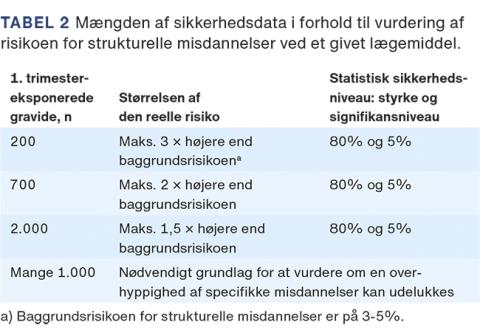 Organogenesen, som finder sted i første trimester, er det tidspunkt i graviditeten, hvor fosteret er mest følsomt for påvirkninger, der kan øge risikoen for strukturelle misdannelser [9]. For at udelukke en overhyppighed af specifikke misdannelser ved brug af et lægemiddel, behøver man data for flere tusind eksponerede gravide i første trimester [9]. Ved data for mere end 200 1. trimester-eksponerede er der god sikkerhed (80% styrke og 5% signifikansniveau) for, at den reelle misdannelsesrisiko ikke er mere end tre gange højere end baggrundsrisikoen, som er på 3-5%. Ved data for 700 eksponerede er risikoen med samme sikkerhedsniveau ikke mere end fordoblet (Tabel 2) [9].