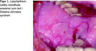 En 86-årig mand med mangeårig hypertension blev indlagt med påvirkede nyreparametre, dehydrering og kompromitteret fødeindtagelse sekundært til en svær erosiv stomatitis. Tre måneder tidligere var hans igangværende antihypertensive behandling med enalapril ændret til losartan 50 mg dagligt, mens han fortsatte en mangeårig lavdosis Magnyl-behandling. På daværende tidspunkt var nyretallene normale med serum (S)-kreatinin på 115 mikromol/l og S-karbamid på 6,4 mmol/l. Tre uger før indlæggelsen blev han febril med almen utilpashed, og få dage før indlæggelsen fik han slimhindeforandringer i næse og mundhule samt hudirritation genitalt. På mistanke om infektion indledte egen læge behandling med nystatinmundskylning og penicillin. Blodprøver viste forhøjet S-kreatinin på 183 mikromol/l og S-karbamid på 15,1 mmol/l. Ved indlæggelsen blev der konstateret svære mundhuleforandringer, og man havde mistanke om herpetisk gingivostomatitis, hvorfor penicillin blev erstattet med aciclovir, mens den igangværende lokalbehandling med nystatin fortsatte. Podning fra mundhule og svælg var negativ for herpes, candida og patogene bakterier. Tilstanden progredierede med fremkomst af fibrinbelagte og letblødende erosioner i kindslimhinderne (Figur 1 ) og ganen samt hæmoragisk skorpedannelse på prolabiet, hvilket gav mistanke om Stevens-Johnsons syndrom eller pemfigus. Anogenitalt var huden ukarakteristisk inflammeret med rødme og ødem. På begge crura var der flere purpuriske papler. Der blev iværksat behandling med lokalsteroid gruppe III. På mistanke om medikamentel udløst SJS blev losartan seponeret. Efter ni dage svandt hudforandringerne på crura, mens slimhindeforandringerne var væk efter to uger.