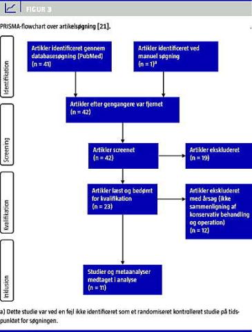 Vi medtog tre metaanalyser, hvori man sammenlignede konservativ behandling med operativ behandling [18-20]. Den seneste af disse metaanalyser [18] er udgivet i 2005, og derfor indgår fire af de fundne randomiserede kliniske studier [10-12, 17] ikke i nogen af de fundne metaanalyser. Se PRISMA-flowch art i Figur 3 .