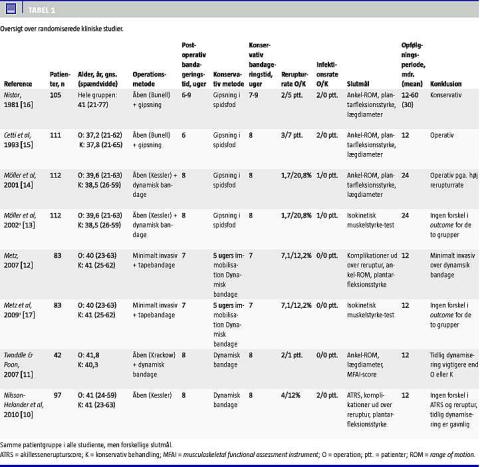 Publicerede randomiserede kliniske studier, hvor man sammenligner operativ behandling med konservativ behandling, er præget af store forskelle i metode og konklusion. Der eksisterer kun få studier af høj kvalitet, flere af dem er af ældre dato [13-16], og der anvendes gipsning i spidsfod som eneste behandling i det konservative regime, hvilket er en behandling, der ikke omtales i nyere studier [9].