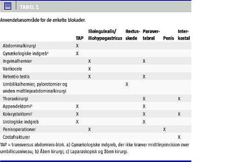 Denne blokade virker på de nedre torakale og den øverste lumbale spinalnerve(r) [9] og kan med fordel bruges til analgesi af abdominalvæggen efter nedre abdominal og gynækologisk kirurgi (Tabel 1 ).