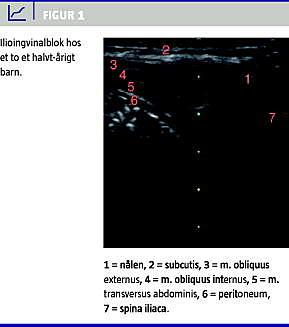 Ved undersøgelser af neonatale kadavere har man påvist stor anatomisk variation med hensyn til placeringen af II/IH-nerverne, hvilket vanskeliggør den klassiske anlæggelse af denne blokade [14]. Således fandt man i en nyere undersøgelse, at LA kun blev administreret anatomisk korrekt i 14% af de tilfælde, hvor den klassiske metode (uden UL) blev brugt [15]. Desuden er der oftere behov for supplering med peroperativ fentanyl (26% vs. 4% af tilfældene) og postoperativ paracetamol (40% vs. 6% af tilfældene) ved en klassisk anlagt blokade [5]. Afstanden mellem de omtalte nerver og peritoneum er i gennemsnit 3,3 mm og kan være helt ned til 1,0 mm [5]. Punktur af peritoneum som komplikation i forbindelse med anlæggelse af II/IH-blokade er beskrevet [13]. Der er god evidens for, at brugen af UL ved anlæggelsen af II/IH-blokade øger succesraten og nedsætter behovet for yderligere analgetika både per- og postoperativt [5]. Endvidere menes brugen af UL at reducere risikoen for accidental punktur af peritoneum hos børn [5].