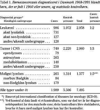Cases var børn, der var født efter den 31. december 1959, og som fik stillet diagnosen leukæmi, CNS-tumor eller malignt lymfom i alderen 0-14 år i perioden fra den 1. januar 1968 til den 31. december 1991. Cases blev identificeret i Cancerregisteret. Efter eksklusion af børn, der var født uden for Danmark blev 1.989 cases inkluderet. Kontrolbørn blev valgt tilfældigt ud fra Det Centrale Personregister. Kontrolbørn skulle være født i Danmark og være i live uden cancer og bo i Danmark på tidspunktet, hvor den tilsvarende case fik stillet cancerdiagnosen. To, tre og fem kontrolbørn, der var matchet på køn, alder og kalendertid, blev udvalgt til hver case med henholdsvis leukæmi, CNS-tumor og malignt lymfom. I alt blev 5.506 kontrolbørn udvalgt (Tabel 1).