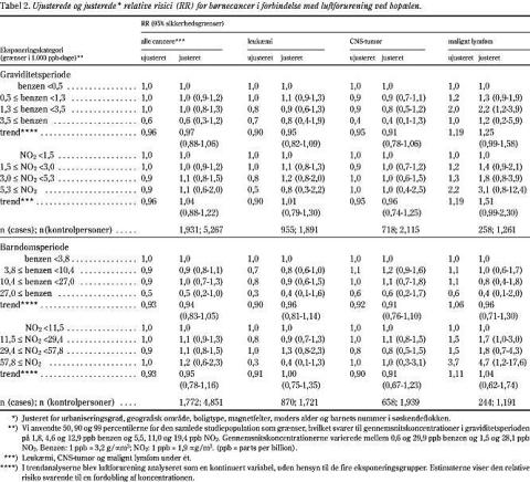 Resultaterne viste ingen øget risiko for leukæmi, tumor i CNS eller malignt lymfom under ét (benævnt »alle cancere« i det følgende) for de tre øverste eksponeringsgrupper i forhold til den laveste eksponeringsgruppe (Tabel 2). For såvel graviditets- og barndomsperioden var der ingen forhøjet risiko selv for de øverste eksponeringsgrupper for benzen og NO2 , og de tilhørende trendanalyser var negative. Resultaterne af de justerede og ujusterede analyser var stort set ens. Separate analyser for de to mest almindelige typer af børnecancer, leukæmi og CNS-tumor, viste heller ikke risikoforøgelse for de højere eksponeringsgrupper, uanset type af luftforurening og uanset eksponeringsperiode.