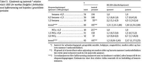 Resultater: Risikoen for leukæmi, tumor i centralnervesystemet og alle inkluderede cancere betragtet under ét var ikke associeret til udsættelsen for hverken benzen eller NO 2 i nogen af perioderne. Risikoen for malignt lymfom steg med 25% (p for trend = 0,06) og 51% (p for trend = 0,05) for en fordobling af koncentrationen af henholdsvis benzen og NO 2 under graviditetsperioden. Associationen sås kun for morbus Hodgkin.