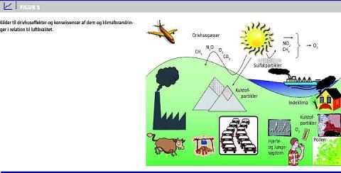 Ozon dannes ud fra flygtige organiske forbindelser og kvælstofoxider i atmosfæren ved kemiske processer, der kræver temperatur og sollys, således at nettoproduktionen i Danmark er beskeden, men det forventes ændret ved klimaforandringer [7, 8]. Metan fra især kvægproduktion, biomasse og kulafbrænding, olie- og gasproduktion og frisætning fra tøende polaregne er hastigt stigende, og metan er den vigtigste organiske forbindelse til ozondannelse, foruden at metan sammen med CO 2 er de vigtigste drivhusgasser [10]. Ozon virker i sig selv også som drivhusgas. I vort nuværende klima bringes ozon mest hertil med vinden sydfra og forbruges af kvælstofoxid fra dieseludstødning, således at niveauet er lavere i byerne end på landet. Ozon er en potent luftvejsirriterende gas, som er associeret med øget sygelighed og dødelighed af især luftvejssygdomme [11, 12]. Mange fremtidsscenarier viser betydeligt stigende ozonniveauer i Nordeuropa - inklusive Danmark - med forventeligt betydende helbredseffekter; men der er usikre forudsætninger, idet risikoen kan modvirkes af forventede reduktioner i emission af de organiske forbindelser og kvælstofoxider, der er udgangspunkt for ozondannelsen, og mulige tærskelværdier for effekterne [7]. Globalt set har ozon store helbredseffekter, og reduktioner i relevante emissioner efter gældende lovgivning og den maksimalt mulige reduktion - især med indsats over for metan - er blevet estimeret til at kunne spare henholdsvis 190.000 og 430.000 liv i 2030, heraf flest i troperne i Afrika og Asien [13].