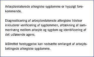Arbejdsrelaterede allergiske sygdomme er hyppigt forekommende og er potentielt mulige at forebygge. Der er identificeret mere end 250 stoffer, som kan give astma og rinitis. Allergisk alveolitis er en sjælden, men alvorlig sygdom, der ofte er betinget af erhvervsmæssige eksponeringer. Diagnosticering af arbejdsrelaterede allergiske lidelser inkluderer verificering af sygdommen, afdækning af en tidsmæssig sammenhæng mellem arbejde og symptomer og om muligt identificering af det udløsende agens. Diagnostiske redskaber som peak flow -monitorering, lungefunktionsmålinger, specifik nasal og bronkial provokation og test for IgE-medieret allergi indgår i udredningen. Målrettet forebyggelse kan formentlig nedsætte omfanget af arbejdsbetingede allergiske sygdomme.