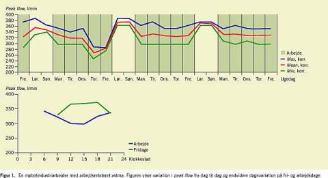 Udredningen består af tre dele: at verificere astmadiagnosen, bekræfte en relevant tidsmæssig sammenhæng mellem arbejdet og symptomerne og om muligt identificere det udløsende agens. Peakflowmonitorering udføres på faste tidspunkter døgnet igennem både i fri- og arbejdsuger (Figur 1 ). Det er vigtigt, at de målte værdier korrigeres til sandt flow, idet manglende korrektion kan føre til under/overdiagnosticering af AA [11]. Et program til indtastning af peak flow -værdier, som kan benyttes til at udskrive figurer som vist i Figur 1, kan downloades fra internettet [12]. Der kan suppleres med lungefunktionsmålinger på arbejdspladsen. Der bør undersøges for sensibilisering for almindelige luftvejsallergener og, hvor det er muligt, suppleres med undersøgelse for sensibilisering over for mistænkte stoffer fra arbejdsmiljøet. Hvis den kausale sammenhæng er usikker, kan der suppleres med specifik bronkial provokatio n over for mistænkte stoffer. Ved provokation er der potentiel mulighed for alvorlige reaktioner (anafylaktisk shock og svært astmaanfald). Specifikke provokationer bør derfor foregå på centraliserede enheder, hvor der er ekspertise i arbejdsmedicin, lungemedicin og eksponeringsteknik.