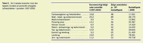 I Tabel 2 ses de ti danske brancher med den højeste incidens af anmeldte allergiske luftvejslidelser i perioden 1997-2002. De fleste anmeldelser kommer fra bagererhvervet og landbruget. Fiskefabrikker og fjerkræslagterier var ikke blandt de hyppigste ved en tilsvarende undersøgelse foretaget i 1989-1991 [25], men resultaterne af nyere danske undersøgelser understøtter, at der er et problem i fiskeindustrien [26]. De øvrige brancher er kendt for at have en høj incidens. Det drejer sig om bagere, ansatte i den farmaceutiske industri, hvor man håndterer mange forskellige højmolekylære stoffer (enzymer, antibiotika mv.), og frisører, der er eksponeret for blegemidler, farver, permanentvæsker etc. I den kemiske industri findes en lang række sensibiliserende stoffer, overvejende lavmolekylære hærdere som f.eks. isocyanater, acrylater og epoxyforbindelser.