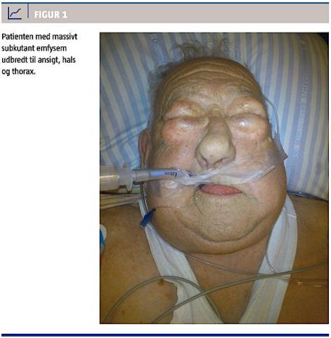 I akutmodtagelsen blev der konstateret krepitation i huden omkring venstre skulder. Patienten var respiratorisk og cirkulatorisk let påvirket med respiration på 18 åndedrag/min, blodtryk på 164/100 mmHg og let takykardi på 118 slag/min. I løbet af 15 min tiltog emfysemet betydeligt, og han blev overflyttet til skadestuen, hvor man fandt stabile vitalmål. Der blev uden klinisk effekt forsøgt nåledekompression (17G × 45 mm-kanyle), og der blev påbegyndt akut anlæggelse af pleuradræn. Emfysemet var nu udbredt til forfladen af thorax, abdomen, venstre overarm, halsen og ansigtet (Figur 1). Patienten var fortsat vågen og havde tiltagende takypnø, brugte den auksilliære respirationsmuskulatur og havde begyndende inspiratorisk stridor. Han desaturerede over de næste minutter til omkring 70% og blev cirkulatorisk påvirket med blodtryksfald og bradykardi. På denne baggrund blev der foretaget akut intubation. Ved laryngoskopi (McCoy) konstaterede man svært forstørret tunge med luftbullae, og slimhinderne var svært hævede i både oro- og laryngopharynx, hvor lumen var tydeligt indsnævret.