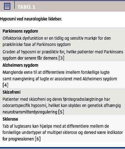 Det olfaktoriske system har fået stor forskningsmæssig opmærksomhed i de senere år, blandt andet gik Nobelprisen i medicin i 2004 til Richard Axel og Linda Buck for deres arbejde med odorantrecepto- rer (OR) og organiseringen af det olfaktoriske system. Olfaktorisk dysfunktion kan muligvis benyttes som præklinisk indikator ved flere neurologiske sygdomme, såsom Parkinsons og Alzheimers sygdom (Tabel 1).