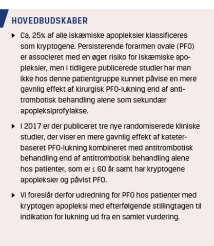 Nyere kliniske studier har vist lavere risiko for apopleksirecidiv ved PFO-lukning end ved trombocythæmmerbehandling hos patienter med en kryptogen iskæmisk apopleksi og samtidig PFO. Vi mener derfor, at der nu er evidens for rutinemæssig ekkokardiografisk undersøgelse for PFO hos patienter med kryptogen apopleksi. Det er vores opfattelse, at disse patienter skal fortsætte trombocythæmmerbehandling livslangt trods PFO-lukning. Patienter med atrieflimren efter PFO-lukning behandles med antikoagulantia. Det er vigtigt at pointere, at den endelige beslutning om henvisning til PFO-lukning skal være taget individuelt på baggrund af alder, byrde af risikofaktorer, grad af shunt samt tilstedeværelse af septumaneurisme, behov for livslang antikoagulansbehandling (herunder NOAK-behandling) og patientens egen præference.