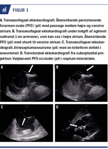 Persisterende foramen ovale (PFO) er en medfødt defekt i septum interatriale og kan ses sammen med et atrieseptumaneurisme (Figur 1) [3]. Prævalensen af PFO er estimeret til 15-25% blandt alle voksne, mens atrieseptumaneurismer kun findes hos 2-3% [4-6]. PFO er tidligere fundet at være associeret med en øget risiko for iskæmisk apopleksi [7]. Da kryptogen apopleksi og PFO også ses hos unge patienter, der har mange resterende leveår og derved risiko for recidiv, har der været stor fokus på at finde den rette sekundære profylakse for denne patientgruppe [8].