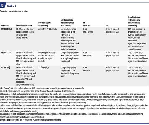 I 2017 udkom der tre nye randomiserede kliniske studier, der alle viste en mere gavnlig effekt af PFO-lukning kombineret med trombocythæmmerbehandling end af antitrombotisk behandling alene hos patienter, som var < 60 år samt havde PFO og kryptogen apopleksi (Tabel 1). I alle tre studier inkluderede man patienter med PFO med hhv. højre-venstre-shunt (i hvile eller under Valsalvas manøvre defineret ved ≥ 1 boble