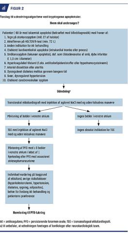 Sammenfattende tyder resultaterne af de nye studier på, at patienter med kryptogene apopleksier og PFO kan have gavn af lukning heraf med efterfølgende livslang trombocythæmmerbehandling. Da number needed to treat var forholdsvist højt i alle tre studier (Tabel 1), bør de økonomiske konsekvenser af behandling overvejes. Fordelene ved at undgå ny apopleksi i en ung patientpopulation er her helt central. Patientgruppen har mange restleveår, hvor handikap fra reapopleksi kan få stor betydning for livskvaliteten, men også være bekostelig grundet tabt arbejdsevne og behov for pleje eller revalidering. Ekkokardiografisk screening af yngre patienter med kryptogen apopleksi (tromber, tumorer, fibroelastomer) er allerede indført som rutine, og ved primær brug af transtorakal ekkokardiografi med kontrast undgås unødige transøsofageale skanninger, hvis der ikke er højre-venstre-shunt. Udgifterne til lukningerne vil dog være af betydning. Derfor står vi over for en række udfordringer i forhold til udvælgelsen af patienter til udredning og PFO-lukning. Det er ikke veletableret, hvor stor en byrde af risikofaktorer der kan accepteres, for at man stadig kan forvente, at PFO-lukning vil have effekt, og derfor bør man være tilbageholdende med PFO-lukning, hvis der er flere oplagte årsager til apopleksi. PFO-lukning er også forbundet med en række komplikationer, herunder især atrieflimren. Den optimale blodfortynding ved fund af atrieflimren efter PFO-lukning er stadig uvis, om end vi mener, at antikoagulansbehandling er indiceret. På dette grundlag mener vi, at der er behov for nye guidelines vedrørende PFO-udredning og PFO-lukning hos patienter med kryptogene apopleksier, gerne med deltagelse af eksperter fra både neurologi og kardiologi. Vores forslag til udredningsforløb er skitseret i Figur 2.