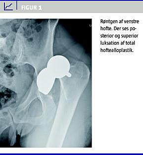 En 62-årig kvinde blev indlagt på psykiatrisk afdeling under diagnosen svær depression. Patienten havde to år tidligere fået total hoftealloplastik på venstre side pga. osteoartrose. Protesen var velplaceret, og der havde ikke været fortilfælde med luksation. Op til indlæggelsen havde patienten haft dårlig appetit og nedsat aktivitetsniveau, hvilket havde resulteret i et vægttab på ti kilo. Ved indlæggelsen blev vægten målt til 63,4 kg. Patienten blev straks opstartet i antidepressiv medicin, men pga. sværhedsgraden af depressionen ordinerede man efter ca. en uge elektrokonvulsiv terapi (ECT). Tre dage efter modtog patienten sin første ECT. Patienten fik 200 mg thiopental intravenøst efterfulgt af 35 mg suxamethon, også intravenøst. Patienten blev efterfølgende rutinemæssigt hyperventileret i ca. et minut. Grundet problemer med for høj impedans ved testningen af det elektroniske kredsløb forsinkedes selve strømafgivelsen i ca. et halvt til et minut. Efter strømafgivelsen fik patienten et meget kraftigt klinisk generaliseret tonisk-klonisk krampeanfald med elektroencefalografi (EEG)-aktivitet i 48 sekunder. Straks efter behandlingen klagede patienten over smerter i venstre hofte, og et røntgenbillede af venstre hofte viste superior og posterior luksation af hoftealloplastikken (Figur 1 ). Hofteprotesen blev efterfølgende reponeret af ortopædkirurg.
