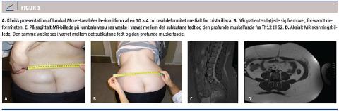 Ved en klinisk undersøgelse blev der afsløret en palpabel, blød, fluktuerende, oval masse på 10 × 4 cm i lumbalregionen (Figur 1A). Massen fremstod som værende beliggende i det dybe subkutane væv, og selv let palpation medførte smerte. Ligeledes blev der fundet moderate striae og nedsat sensibilitet i det affekterede hudområde. En ultralydskanning var inkonklusiv, og der kunne hverken findes en definerbar masse eller lokaliseret Dopplerreaktion. Ved en efterfølgende MR-skanning afsløredes der væske mellem det subkutane fedt og den profunde muskelfascie medialt på crista iliaca; området målte 17 cm kaudokranialt, 12 cm i bredden og 9 mm i dybden (Figur 1C og Figur 1D). De kliniske og billeddiagnostiske undersøgelser understøttede diagnosen MLL, og patienten blev henvist til en plastikkirurgisk afdeling til videre behandling. Hun blev her anbefalet vægttab før en eventuel operation pga. den generelle risiko ved bedøvelsen.