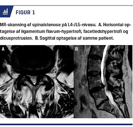 Den radiologiske definition er ikke helt entydig. Nogle definitioner er baseret på myelografi eller myelografi med efterfølgende CT, men i praksis anvendes der nu næsten udelukkende MR-skanning (Figur 1). Spi-nalkanalens tværsnitareal set på en MR-skanning benyttes ofte, og LSS defineres som et areal mindre end 70 mm2 [13, 14]. Mangel på fri cerebrospinalvæske rundt om filamenterne på en T2-vægtet undersøgelse eller nerve root sedimentation sign er korreleret til kliniske symptomer [15, 16].