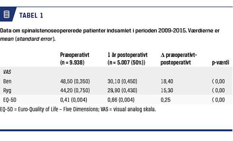 I Tabel 1 vises effektmål hhv. præoperativt og efter