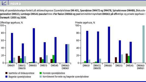 Resultater: Der blev foretaget henholdsvis 2.111 og 903 spondylodeser på 14 offentlige og seks private sygehuse i perioden 2005-2006. Operationsaktiviteten steg fra 993 til 1.118 indgreb på de offentlige og fra 393 til 510 indgreb på de private hospitaler, hvor sidstnævnte udførte 31,3% af alle indgreb i 2006. Der blev foretaget 196 isættelse af diskusproteser, 162 forreste spondylodeser, 2.309 bageste spondylodeser og 347 kombinerede forreste og bageste spondylodeser. Operationsindikationen var 245 spondyloser, 1.174 spinalstenoser, 947 diskusdegenerationer, 600 spondylolisteser og 45 for lumbago. Totalt blev bageste lumbal spondylodese anvendt hos 81,9% af patienterne på de private sygehuse og hos 74,3% af patienterne på de offentlige sygehuse.