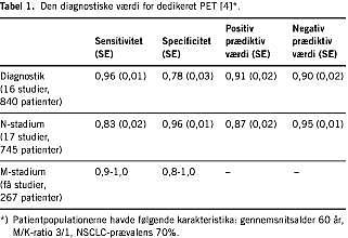 Brugen af FDG-PET til udredning af SPN er undersøgt i talrige studier, hvor man samlet har inkluderet over 1.000 patienter med lungecancer af ikkesmåcellet type (NSCLC) [10]. Fælles for disse studier er en høj prævalens af lungecancer, gennemsnitlig 70%. Studierne er af svingende kvalitet, men resultaterne er konsistente. Der er ved flere metaanalyser fundet sensitivitet for PET på 96%, specificitet på 75-80% og positiv og negativ prædiktiv værdi på ca. 90% [4, 10, 11] (Tabel 1 ). Den forholdsvis lave specificitet skyldes forekomst af falsk positive PET, som især skyldes øget FDG-optagelse i aktiverede makrofager. Dette kan ses ved bl.a. granulomatøs inflammation og visse infektioner [10, 12]. Falsk negative fund er sjældne, men kan forekomme ved lavmetabole tumorer eller tumorer med lav celledensitet. Ved meget små tumorer kan FDG-optagelsen blive undervurderet og medføre falsk negative svar. Nyere PET-skannere har dog høj diagnostisk værdi også ved tumorer på under 10 mm [10].