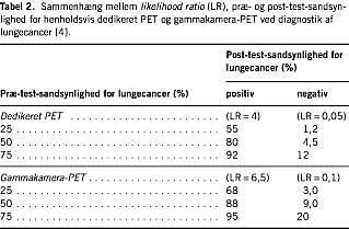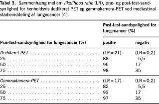 I en metaanalyse fra 1999 har man sammenlignet den diagnostiske værdi af hhv. PET og CT ved mediastinal stadieinddeling hos patienter med NSCLC [18]. Data fra 14 PET-studier (514 patienter) og 29 CT-studier (2.226 patienter) blev sammenlignet, og forfatterne fandt, at PET var signifikant bedre end CT til vurdering af spredning til hilus og mediastinum. PET havde således en sensitivitet og specificitet på hhv. 79% og 91%, tallene for CT var hhv. 60% og 77%. Dette svarer til en positiv prædiktiv værdi for PET på 90% og for CT på 50%. De negative prædiktive værdier er hhv. 93% og 85%. Lignende resultater er fundet i andre studier, heriblandt det eneste randomiserede studie med PET [4, 11, 19, 20]. Værdien af gammakamera-PET ved mediastinal stadieinddeling er vurderet i enkelte studier. Resultaterne herfra tyder på, at gammakamera-PET har en diagnostisk værdi på højde med dedikeret PET (Tabel 3 ), dog med en lavere sensitivitet for metastaser på under 2 cm [4, 11, 21]. Data, der sammenligner værdien af kombineret PET/CT med PET alene, er få, men de tyder på, at såvel sensitivitet som specificitet forbedres ved brug af PET/CT [7].