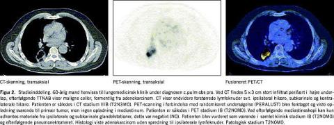 Op mod 50% af alle patienter med NSCLC har fjernmetastaser (stadium IV) på diagnosetidspunktet [1]. NSCLC metastaserer typisk til hjerne, knogler, lever og binyrer. PET er fundet at være lige så sensitiv, men mere specifik end knoglescintigrafi til at finde knoglemetastaser og ligeledes mere sensitiv og specifik end CT til diagnostik af binyremetastaser. Resultaterne af enkelte undersøgelser peger på, at det samme gør sig gældende mht. levermetastaser [4, 10, 11]. Pga. af den høje fysiologiske FDG-metabolisme i hjernen er almindelig helkrops-FDG-PET uegnet til at udelukke cerebrale metastaser, idet man med PET kun ser ca. 60% af de metastaser, der kan ses med CT [10]. Med en præoperativ PET vil man hos 5-15% af patienterne finde ellers ikkeerkendte metastaser, således at en nyttesløs operation kan undgås, og hos andre 5-10% vil man kunne afkræfte en metastasemistanke [19, 20].
