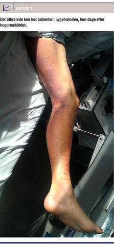 En 55-årig tidligere rask mand blev bidt af en hugorm på fodryggen. I løbet af den første halve time fik han tiltagende smerte, hævelse og misfarvning lokalt omkring bidstedet. Efter yderligere en time blev han tiltagende bleg og utilpas, hvorefter han blev indlagt. Objektivt havde han initialt hævelse over fodryggen og anklen, blålig misfarvning omkring bidstedet og op ad femur samt rødlig misfarvning til lyskenniveau (foreneligt med lymfangitis) og ømhed i lysken. Fire timer efter biddet havde han en enkelt opkastning.
