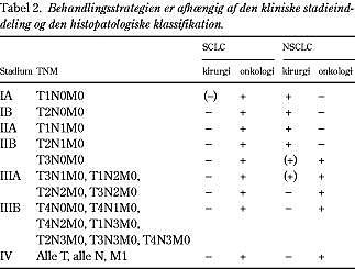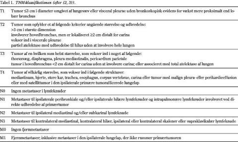 Hvad er sygdommens udbredelse? Med udgangspunkt i tidligere klassifikationer definerede The American Joint Committee (AJC) og Union Internationale Contre le Cancer (UICC) i 1986 det såkaldte nye internationale klassifikationssystem (TNM), som siden er blevet modificeret i 1997 (Tabel 1). T står for primærtumors størrelse og udstrækning, N står for regional lymfeknudeinvolvering, og M står for fravær eller tilstedeværelse af fjernmetastaser. Afhængigt af TNM-klassifikationen er patienten i stadium I, II, III eller IV. For eksempel svarer stadium IA til klassifikationen T1N0M0, det vil sige en tumor <3 cm (T1), der ikke har spredt sig til lymfeknuderne (N0) og er uden påviselige fjernmetastaser (M0). Princippet anvendes primært ved NSCLC, mens man ved SCLC skelner mellem begrænset eller udvidet sygdom, idet 95% ved diagnosen har stadium IIIB eller IV-sygdom. Ved begrænset sygdom forstås, at tumoren er begrænset til én lunge + mediastinale og supraklavikulære lymfeknuder, dvs. at der er mulighed for at give stråleterapi med kurativ intention.