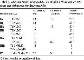 Femårsoverlevelsen for danske lungekræftpatienter har i de seneste 50 år ligget fast på omkring 5%. Knap 20% af patienter med NSCLC opereres radikalt, og femårsoverlevelsen for disse er ca. 30%. Femårsoverlevelsen for hele sygdomsgruppen er ca. 5%, hvilket er beskedent sammenlignet med i fx USA og Canada, hvor den i visse regioner er op til 15%. Stadiet er afgørende for prognosen. I Tabel 3 er der angivet en skønnet fordeling på stadier i Danmark og USA samt den estimerede femårsoverlevelse. Med DLCR forventer vi allerede i 2002 at få et bedre overblik over stadier og overlevelse i Danmark. Det er DLCG's målsætning, at femårsoverlevelsen for lungecancer forbedres fra 5% til mindst 10%. De væsentligste forudsætning er tidligere diagnose, så antallet af operationer øges med 50% fra de nuværende ca. 500 (20%)