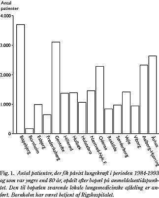 Introduktion: Kræftbehandlingen i Danmark er ved at blive styrket, fordi vore resultater blev anset for at være dårligere end i de øvrige nordiske lande. Dette blev udlagt, som om kvaliteten af kræftbehandlingen i Danmark var for ringe på grund af en dårlig organisering. Vore problemer med dårlig overlevelse kunne imidlertid skyldes en dansk livsstil med rygning samt sen kontakt med primærsektoren og specialafdelinger. Kvaliteten af dansk kræftbehandling var ikke blevet undersøgt, og vi fandt det derfor relevant at undersøge, om forskelle i overlevelsen ved lungekræft var relateret til patienternes bopæl og dermed til både sociale faktorer og sygehus.
