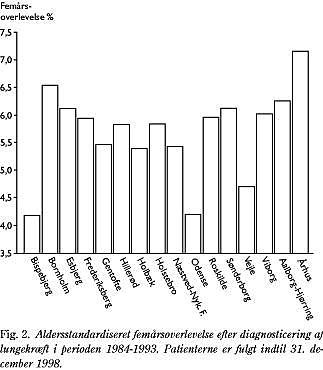 Lungekræftpatienternes overlevelse eller måske kvaliteten af kræftbehandlingen, som det har været udtrykt (1), var langt bedre i nogle danske centre end tidligere antaget fx i Nordjyllands Amt og Århus Amt (Fig. 2 og Fig. 3). Dette er uventet godt nyt for vore patienter, som via pressen har kunnet få det unuancerede indtryk, at kvaliteten af kræftbehandlingen generelt var dårlig i Danmark. På den anden side er resultaterne dårlige i Københavns Kommune, Sønderjyllands Amt og Fyns Amt, men der er formentligt flere årsager hertil. Hypotesen, at forskellene mellem danske amter i femårsoverlevelsen efter diagnosticering af lungekræft var lige så stor som forskellene imellem de skandinaviske lande, kunne ikke afkræftes. Forskellen imellem amter med den laveste femårsoverlevelse (Københavns Kommune=4,2%) og den højeste femårsoverlevelse (Århus=7,0%) er af samme størrelse som forskellen i femårsoverlevelsen i Norden, hvor Danmark havde den laveste femårsoverlevelse (mænd ca. 4%, kvinder ca. 5%) set i forhold til Sverige (mænd ca. 8%, kvinder 9%), Norge (mænd ca. 6%, kvinder 7%) og Finland (mænd ca. 10%, kvinder ca. 11%) (2).