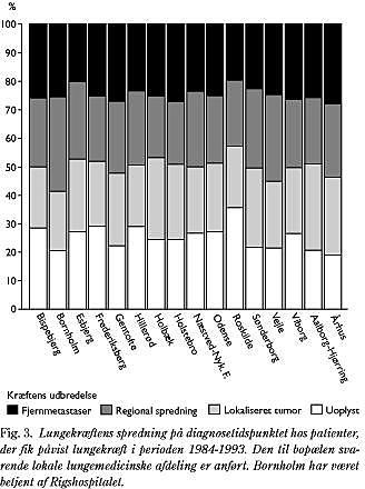 Antal kræfttilfælde per center fremgår af Fig. 1 , som viser, hvilke centre der var relativt store efter danske forhold. Den aldersstandardiserede femårsoverlevelse i perioden 1984-1993 fremgår af Fig. 2 . Lungekræftens udbredelse på diagnosetidspunktet fremgår af Fig. 3 .