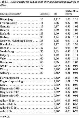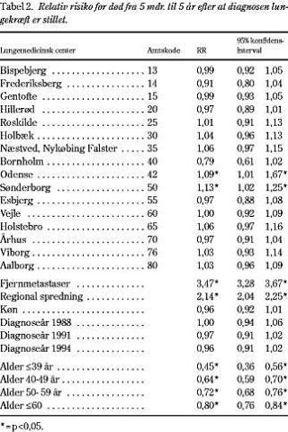 Hvis overlevelsen deles op i perioden umiddelbart efter, at diagnosen er stillet (<5 mdr. efter diagnosetidspunkt) (Tabel 1) og perioden efter (_5 mdr. efter diagnosetidspunktet) (Tabel 2), ses det, at forskellene er mest markante i perioden lige efter diagnosen (Tabel 1, Bispebjerg, Viborg, Aalborg og Århus), hvilket kunne skyldes, at patienterne fik stillet diagnosen lungekræft for sent i Bispebjerg og måske var i for dårlig almentilstand, snarere end at behandlingen i sygehuset regi var for ringe. Denne forskel forsvinder, når vi ser på langtidsresultaterne (Tabel 2) hvor Bispebjergs resultater ikke adskiller sig fra landsgennemsnittet, men i stedet ses signifikant ringere resultat end landsgennemsnittet i Sønderjyllands Amt og Fyns Amt.