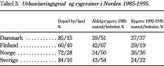Det er tidligere meget overbevisende blevet dokumenteret i arbejder af Ostenfeld (6) og senere Clemmesen (7), at urbanisering er en væsentlig risikofaktor for død af kronisk lungesygdom. Rygevaner er en anden væsentlig risikofaktor, der burde have været inddraget i diskussionen om kvaliteten af dansk kræftbehandling (8-10). Netop på områderne urbaniseringsgrad og rygevaner var der store forskelle i Norden (Tabel 3) (11, 12), som gjorde sammenligning af overlevelse vanskelig at tolke. Vi var i Danmark sammenlignelige med Sverige, hvad angår urbaniseringsgrad, men ikke hvad angår rygevaner, og med Norge var vi i Danmark sammenlignelige, hvad angår rygevaner, men ikke hvad angår urbaniseringsgrad (Tabel 3). Vi ved derfor ikke, om det var kvaliteten af lungekræftbehandlingen i Danmark, der var ringere end i det øvrige Norden, eller om den dårlige overleve lse i visse danske amter skyldtes den særlige danske livsstil, med en høj grad af urbanisering kombineret med for megen rygning (Tabel 3).