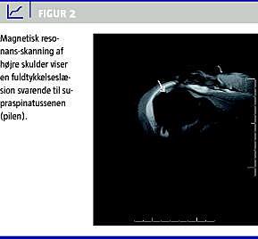 Magnetisk resonans-skanning viste en fuldtykkelseslæsion svarende til supraspinatussenen. Patienten blev tilbudt subakut operation med henblik på suturering af senen.