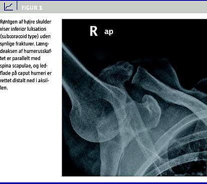 Patienten mødte i skadestuen med fuldt abduceret og let udadroteret højre arm. Ved klinisk undersøgelse kunne man palpere caput humeri i aksillen, og der var svære smerter, hvis man forsøgte at adducere armen. Der var normal sensibilitet i nervus axillaris' område lateralt på skulderen (regiment badge area ), dog var der let snurrende fornemmelse i spidsen af fingrene, som forsvandt efter reponering. Røntgenundersøgelse af højre skulder viste inferior luksation (subcoracoid) uden synlige frakturer (Figur 1 ).
