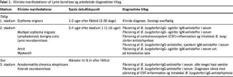 De kliniske manifestationer af LB er velbeskrevne [1-3]. Stadie 1- og stadie 2-manifestationer har pga. en relativ kort inkubationstid en karakteristisk årstidsvariation (maj til december). De remitterer stort set altid selv uden behandling. Kun hos 1-2% af patienterne med NB udvikles der en kronisk og dermed ikkeselvlimiterende form for borreliose.