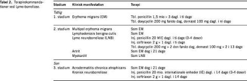 Den rekommanderede varighed af antibiotisk behandling er især i amerikansk litteratur angivet at være 20-30 dage evt. længere, uden at man i kontrollerede kliniske studier har dokumenteret dette. I Europa har behandlingsvarighed ved EM og NB altid været 10-14 dage, som i flere kliniske studier er vist at være effektivt. I et nyligt US-studie fandt man ens behandlingsrespons hos EM-patienter, der fik 10 vs. 20 dages doxycyclinbehandling [7]. Der forligger således ingen dokumentation, der understøtter en behandlingsvarighed længere end 14 dage.