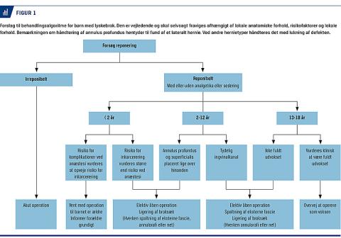 I Figur 1 giver vi vores forslag til en behandlingsalgoritme ved lyskebrok hos børn. Hvis lyskebrokket er irreponibelt, er der indikation for akut operation, som skal initieres særlig hurtigt ved tegn på kompromitteret blodforsyning. Hvis lyskebrokket er reponibelt, afhænger behandlingsvalget dels af barnets alder og anatomi, dels af symptombillede og komorbiditeter, der kan påvirke risikoen for anæstesiologiske komplikationer. Behandlingsalgoritmen tager udgangspunkt i den tilgængelige forskning og internationale retningslinjer, og hvor disse kommer til kort, har vi forsøgt at lægge os så tæt som muligt op ad den almene praksis på danske hospitaler.