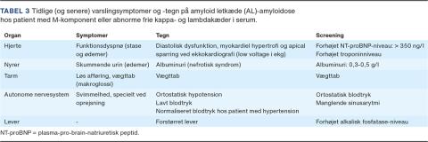 Prognosen ved AL-amyloidose er markant forbedret. De samme lægemidler, som er effektive ved myelomatose er også effektive ved AL-amyloidose [26]. De beslægtede sygdomme skyldes begge klonale plasmaceller. Klonen ved primær AL-amyloidose ligner fænotypisk MGUS; blot er den producerede klonale lette kæde strukturelt abnorm og amyloidogen. Klonen er ikke proliferativ som ved myelomatose. Men uden relevant behandling progredierer de amyloide aflejringer til oftest irreversibelt organsvigt. Mantraet er altså også her diagnostisk awareness og tidlig diagnostik (Tabel 3).