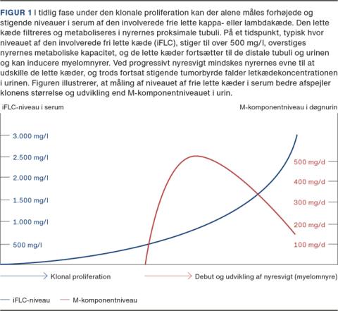 Plasmaceller syntetiserer et overskud af kappa- og lambdakæder, formentlig for at sikre tilstrækkeligt antal byggesten til dannelse af de komplette immunglobuliner. I starten af 00’erne etableredes det første immunoassay til måling frie kappa- og frie lambdakæder i serum (FLC-analyse) [11]. Hos raske ligger niveauet for begge kæder på 5-25 mg/l og balanceret med en kappa-lambda-ratio på 0,5-1,7. De lette kæder er små molekyler, der passivt filtreres gennem glomerulusmembranen, reabsorberes og metaboliseres i de proksimale tubuli. Ved tilstande med inflammation og nyrepåvirkning kan serumniveauerne stige, men ratio bevares stort set. Ved nyrepåvirkning kan der dog ses lidt større spændvidde af ratio, hvorfor let abnorm ratio ved nyresvigt isoleret set ikke bør give mistanke om B-celle-klonal sygdom.