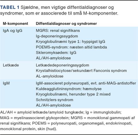Monoklonal gammopati af ukendt signifikans (MGUS) er en klonal, men ikke malign plasmacelledyskrasi. Forekomsten stiger med alderen og er > 3% hos personer > 50 år [1, 2]. MGUS er asymptomatisk hos majoriteten, men immunglobulin (Ig)M-MGUS medfører ikke sjældent perifer polyneuropati [3]. Det er for nyligt beskrevet, at MGUS kan have »renal signifikans«, kaldet MGRS [4], herunder som led i immunglobulindeponeringssygdom. Anden renal problematik kan være letkæde (AL)-amyloidose. Det er derfor vigtigt at undersøge for albumin i urinen ved MGUS. Andre vigtige, men sjældne, sygdomme associeret til M-komponenter [5] er resumeret i Tabel 1. Selv små M-komponenter bør konfereres med hæmatologisk ekspertise eller henvises til vurdering i hæmatologisk afdeling.