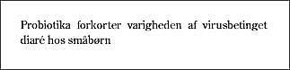 Gennem de seneste ti år er der publiceret en lang række RCT, som beskriver signifikante effekter af probiotika ved akut diaré hos småbørn (2, 3, 11). Det drejede sig hyppigst om hospitalsindlagte, tidligere raske børn med moderat dehydrering og overvejende med rotavirus gastroenteritis. Den vigtigste effektparameter har været varighed af diaré efter start af behandlingen. I gennemsnit reducerede probiotika diarévarigheden med ca. 1,5 dag. I otte ud af 12 undersøgelser blev der anvendt Lactobacillus GG ATCC 53103 (L. GG), men andre mikroorganismer, fx L. reuteri (13), og L. acidophilus LB, givet i samme dosering synes at have en tilsvarende effekt. Behandling med L. GG, givet inden for to døgn efter symptomdebut til børn med gastroenteritis, reducerede signifikant varigheden af hospitalsindlæggelse i forhold til behandling med placebo (3).