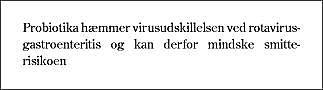 Vi har i to RCT undersøgt virkningen af en kombination af to nylig identificerede probiotika, L. rhamnosus 19070-2 og L. reuteri DSM 12246 dels hos hospitalsindlagte børn med gastroenteritis (15), og dels hos uselekterede børn med mild, akut diaré, rekrutteret fra vuggestuer og behandlet i hjemmet (16). De anvendte stammer var udvalgt blandt 48 mælkesyrebakteriestammer på grundlag af bl.a. antimikrobiel aktivitet mod patogene bakterier og god adhæsionsevne, såvel in vitro (17) som in vivo (upublicerede data). Blandt indlagte børn og blandt børn med mild diaré fandtes, sammenlignet med placebobehandling, en signifikant reduktion af diarévarigheden efter tidlig behandling med L. rhamnosus 19070-2 og L. reuteri DSM 12246 (fra gennemsnitlig 5,4 til 3,3 dage blandt de indlagte børn og fra 5,8 til 3,3 dage blandt vuggestuebørn). Undersøgelsens resultater svarer til den effekt, der tidligere er påvist for den hyppigst undersøgte Lactobacillus -stamme L. GG. Varigheden af hospitalsindlæggelsen blev reduceret med 48% (p = 0,03), og antallet af patienter, som efter fem dages behandling med disse nye probiotika udskilte rotavirus, blev reduceret (46% i placebogruppen vs. 12% i behandlingsgruppen, p = 0,025).