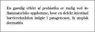 Den hidtidige dokumentation for terapeutisk anvendelse af probiotika ved AD bygger således kun på to studier, udført af samme forskergruppe, som hos selekterede spædbørn med let til moderat eksem påviste signifikant bedring i eksemets sværhedsgrad. Vi har i en randomiseret, dobbeltblind, overkrydsningsundersøgelse (upublicerede data) med en gruppe af større børn med moderat og svært kronisk eksem fundet klinisk effekt af seks ugers behandling med en kombination af Lactobacillus spp. (L. rhamnosus 19070-2 og L. reuteri DSM 12246) med dokumentede probiotiske egenskaber (14-16). Mælkesyrebakterierne påvirkede tarmens barrierefunktionen, idet permeabiliteten af tyndtarmsmucosa blev mindsket under behandlingen med probiotika. Børn i første leveår har i forhold til ældre børn øget tarmpermeabilitet. Ligeledes er sammensætningen af tarmfloraen betydelig mere påvirkelig af ydre faktorer herunder kostændringer i de første leveår end efter 3-4-års-alderen, hvor den gastrointestinale flora er stabil og minder om den, man finder hos voksne. På grund af de nævnte forhold gives probiotika på denne indikation formentlig mest optimalt i de første levemåneder.