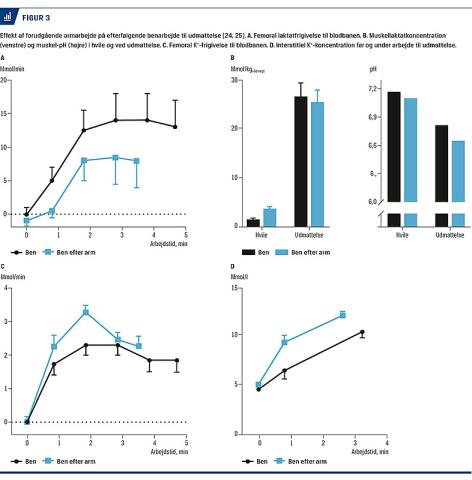 For at undersøge effekten af laktat og H+ på træthed hos mennesker er der blevet udført intenst armarbejde for at hæve laktatkoncentrationen i blodet før udmattende benarbejde [24, 25]. Her fandt man, at forudgående armarbejde, der hævede det systemiske laktatniveau til 12 mM, reducerede præstationsevnen med ca. 30% under efterfølgende benarbejde sammenlignet med en kontrolsituation uden forudgående armarbejde (Figur 3) [24]. Den reducerede præstation med forudgående armarbejde var forbundet med en reduktion i frigivelsen af laktat fra de kontraherende benmuskler (Figur 3A) og en lavere muskel-pH (6,65 vs. 6,82) (Figur 3B). Endvidere forårsagede forudgående armarbejde en større K+-frigivelse fra den arbejdende
