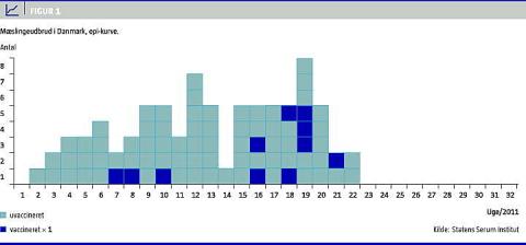 I 1987 blev vaccination mod mæslinger, fåresyge og røde hunde (MFR) en del af børnevaccinationsprogrammet. Mæslinger har siden været en sjælden sygdom i Danmark med et årligt gennemsnit på ti tilfælde i årene 1998-2010 [1]. I 2011 blev Danmark ramt af det største mæslingeudbrud i 15 år. I alt 81 personer fik diagnosticeret mæslinger, og heraf var 11 blevet MFR-vaccineret én gang (Figur 1 ). Mæslingevirus er meget smitsomt og kan medføre dødelige komplikationer som pneumoni og encefalitis. Inkubationstiden er ca. ti dage, som følges af 2-4 dages prodromalperiode med feber, forkølelsessymptomer og relativ dårlig almen tilstand. Over de næste 3-5 dage breder et makulopapuløst eksantem sig, og temperaturen stiger.