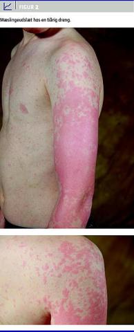 I foråret 2011 tog en mor sin tiårige dreng med til sin praktiserende læge, da drengen havde haft høj feber og smerter i nakken samt været mat i et døgn. Drengen havde forstørrede, røde tonsiller, rødt svælg og hævede lymfeknuder på halsen. En kapillærblodprøve viste et C-reaktivt protein-niveau på < 8 mg/l og normal leukocytdifferentialtælling. En streptokok-antigentest var negativ. Der blev ordineret amoxicillin 500 mg × 2 dagligt på mistanke om bakteriel tonsillitis. Moderen kontaktede lægevagten to døgn senere. Drengen havde ikke fået det bedre, og hun oplyste, at han havde fået et udslæt, som var begyndt omkring ørerne og havde bredt sig til overkroppen. Vagtlægen undersøgte drengen og fandt, at han havde normale tonsiller, bilateral konjunktivitis og et højrødt makulært, erytematøst, delvist sammenflydende udslæt på truncus. Vagtlægen skønnede, at mæslinger var usandsynligt, fordi drengen var blevet MFR-vaccineret, da han var 17 måneder gammel, og der ikke havde været mæslinger i drengens omgangskreds. Vagtlægen vurderede, at udslættet var medikamentelt betinget, og drengen fortsatte amoxicillinbehandlingen. Moderen blev rådet til at kontakte den praktiserende læge to dage senere for opfølgning. Efter seks dage tog hun til læge med drengen, fordi der stadig var høj feber. Udslættet havde bredt sig til armene, men drengen havde det alment bedre. Lægen fandt et makulopapulært, sammenflydende udslæt på især arme og ansigt, men også på truncus (Figur 2 ) og fik mistanke om mæslinger ud fra forløbet og det karakteristiske udslæt. Ved kontrol fem dage senere var drengen afebril og alment upåvirket. Udslættet var afbleget betydeligt. En blodprøve viste trombo-cytose (628 × 10 9 trombocytter/l), og forhøjede niveauer af immunglobulin (Ig)G- og IgM-antistof mod mæslingevirus, hvilket var foreneligt med den aktuelle infektion. RNA kunne ikke påvises i serum eller urin, hvorfor typning ikke var mulig. Tilfældet blev anmeldt til embedslægen.
